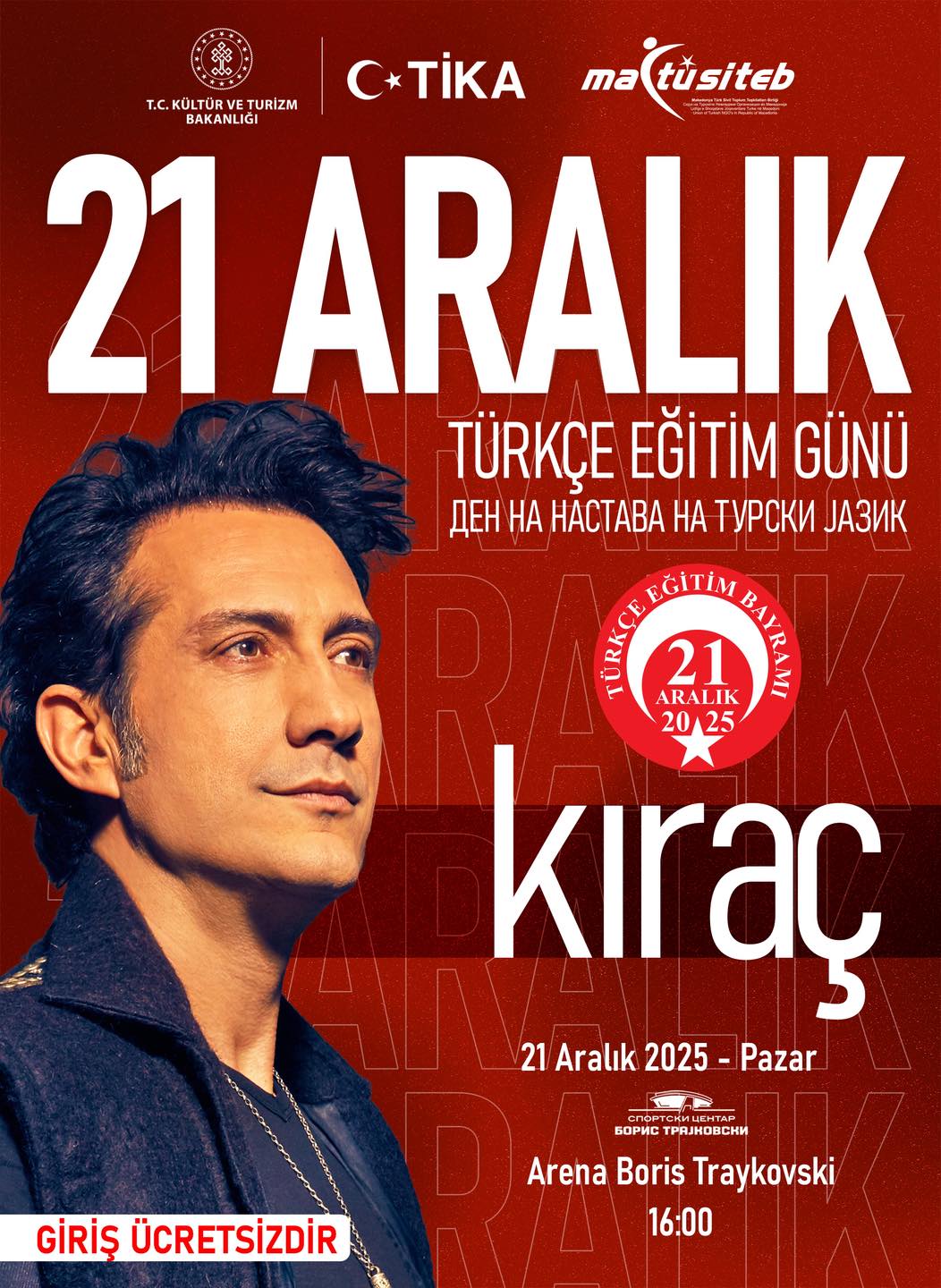 Makedonya Türk Sivil Toplum Teşkilatları Birliği (MATÜSİTEB) ve Türk İşbirliği ve Koordinasyon Ajansı Başkanlığı (TİKA) işbirliğinde 21 Aralık Türkçe Eğitim Günü Milli Bayramı kapsamında Anadolu rock müziği yorumcusu, besteci ve söz yazarı Kıraç, Kuzey Makedonya’nın başkenti Üsküp’te konser verecek.