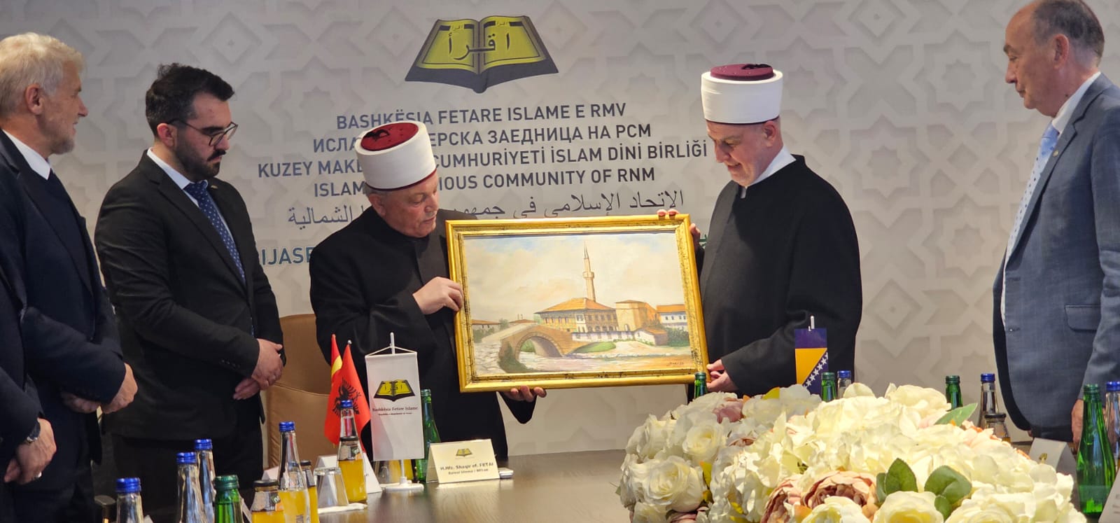 “11 Nisan 2025 tarihinde Kuzey Makedonya Cumhuriyeti İslam Dini Birliği Reisul Uleması H. Hfz. Şakir Ef. Fetai ve yakın çalışma arkadaşları, Bosna-Hersek İslam Birliği Başkanı Reisul Ulema Dr. Hüseyin Ef. Kavazoviç ve beraberindeki heyeti makamında kabul etti. Misafir heyette Sancak Müftüsü Dr. Mevlütin Ef. Dudić, Bosna Hersek İslam Birliği Meclis Başkanı Edhem Bičakčić, Diaspora Müdürü Muhamed Jusić, Sancak Müftüler Meclisi Başkanı Dr. Almir Pramenkoviç, Kavazoviç’in Özel Kalem Müdürü Rifat Fatiç, Halkla İlişkiler Sorumlusu Azra Efendiç Eminoviç ve Dış İlişkiler Sorumlusu Muhamed Yugo yer aldı. Bosna Hersek İslam Birliği’nin üst düzey heyeti, Reisul Ulema H. Hfz. Şakir Ef. Fetai ile birlikte İDB Genel Sekreteri, İDB müftüleri, Riyaset daire müdürleri, Üsküp İslami Bilimler Fakültesi Dekanı ve “İsa Bey” Medresesi müdürü tarafından karşılandı.