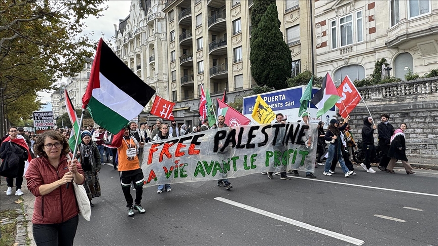 Fransızca, İngilizce ve Arapça İsrail karşıtı ve Filistin’e özgürlük talep eden sloganlar atan göstericiler, Gazze’de yaşanan soykırımın son bulmasını talep etti.