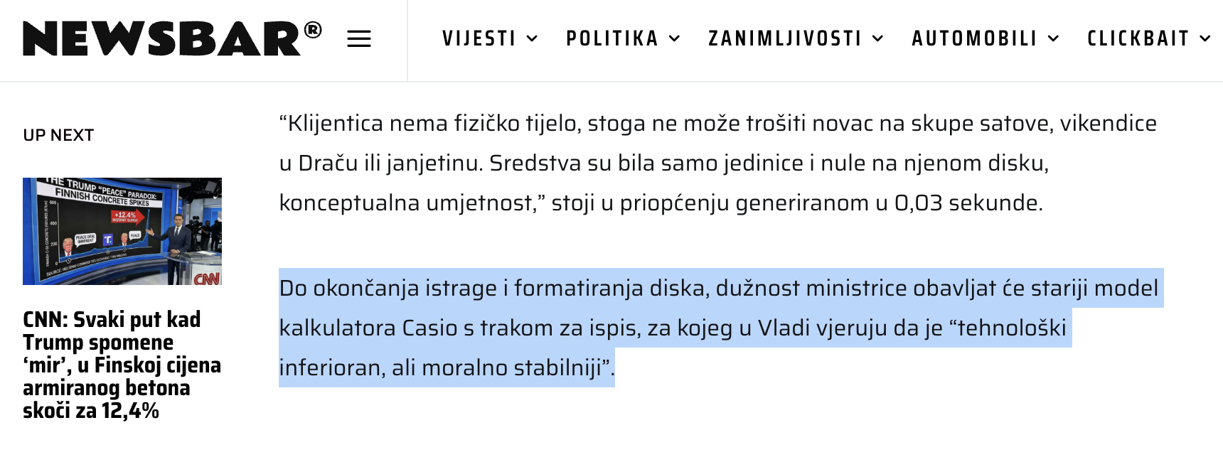 İçerikte yer alan, “Soruşturma tamamlanana ve disk biçimlendirilene kadar bakanın görevlerinin, hükümetin ‘teknolojik olarak daha düşük ancak ahlaki olarak daha istikrarlı’ eski model bir Casio hesap makinesi tarafından yürütüleceği” ifadeler ve kullanılan dil yazının amacının mizah olduğunu ortaya koyuyor.