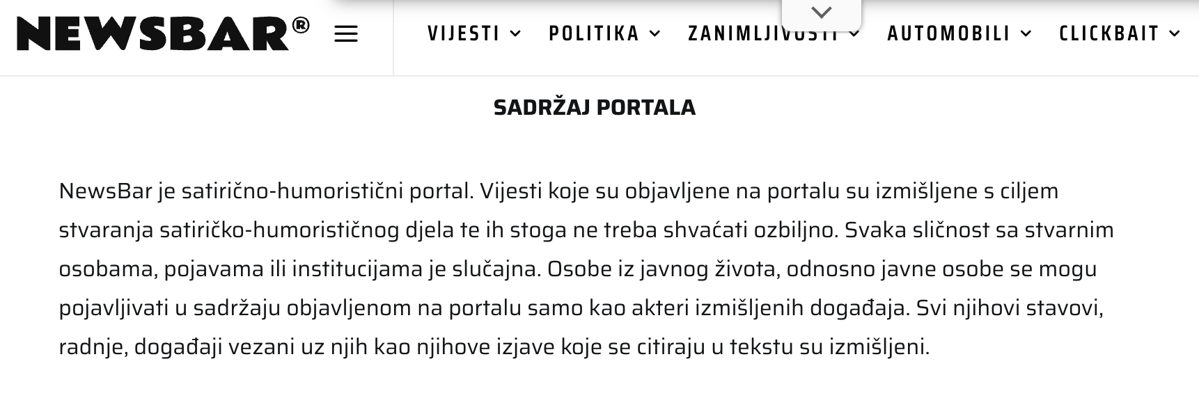 NewsBar’ın internet sayfasında, Hırvatça yayımlanan uyarı metninde, sitenin hiciv ve mizah amaçlı içerik üreten bir platform olduğu, yayımlanan haberlerin tamamen kurgudan ibaret olduğu belirtiliyor. Metinde, gerçek kişi, kurum veya olaylarla olası benzerliklerin tesadüf olduğu vurgulanırken, aktarılan tutum, eylem ve ifadelerin gerçeği yansıtmadığı ifade ediliyor.