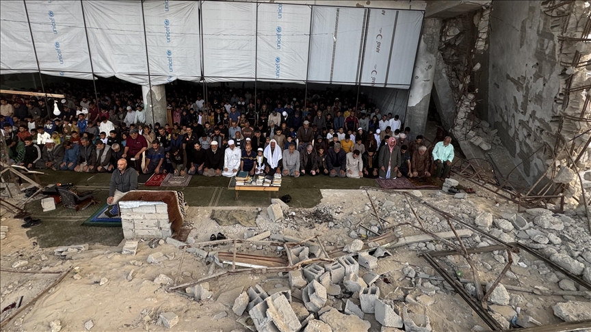 Kentin güneyindeki Han Yunus’ta daha önce İsrail bombardımanıyla büyük bir kısmı yıkılmış olan İmam Muhammed el-Bani Camii enkazı üzerinde çok sayıda kadın ve çocuğun da aralarında bulunduğu yüzlerce Filistinli bayram namazını kıldı.