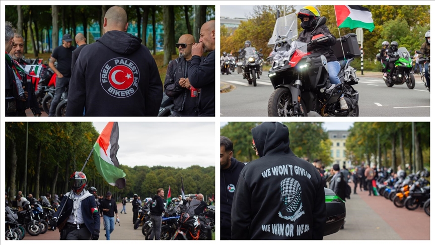 Malieveld Meydanı’nda buluşan motosiklet sürücüleri kentin ana caddelerinde konvoy oluşturarak Filistin’e destek gösterisi yaptı.