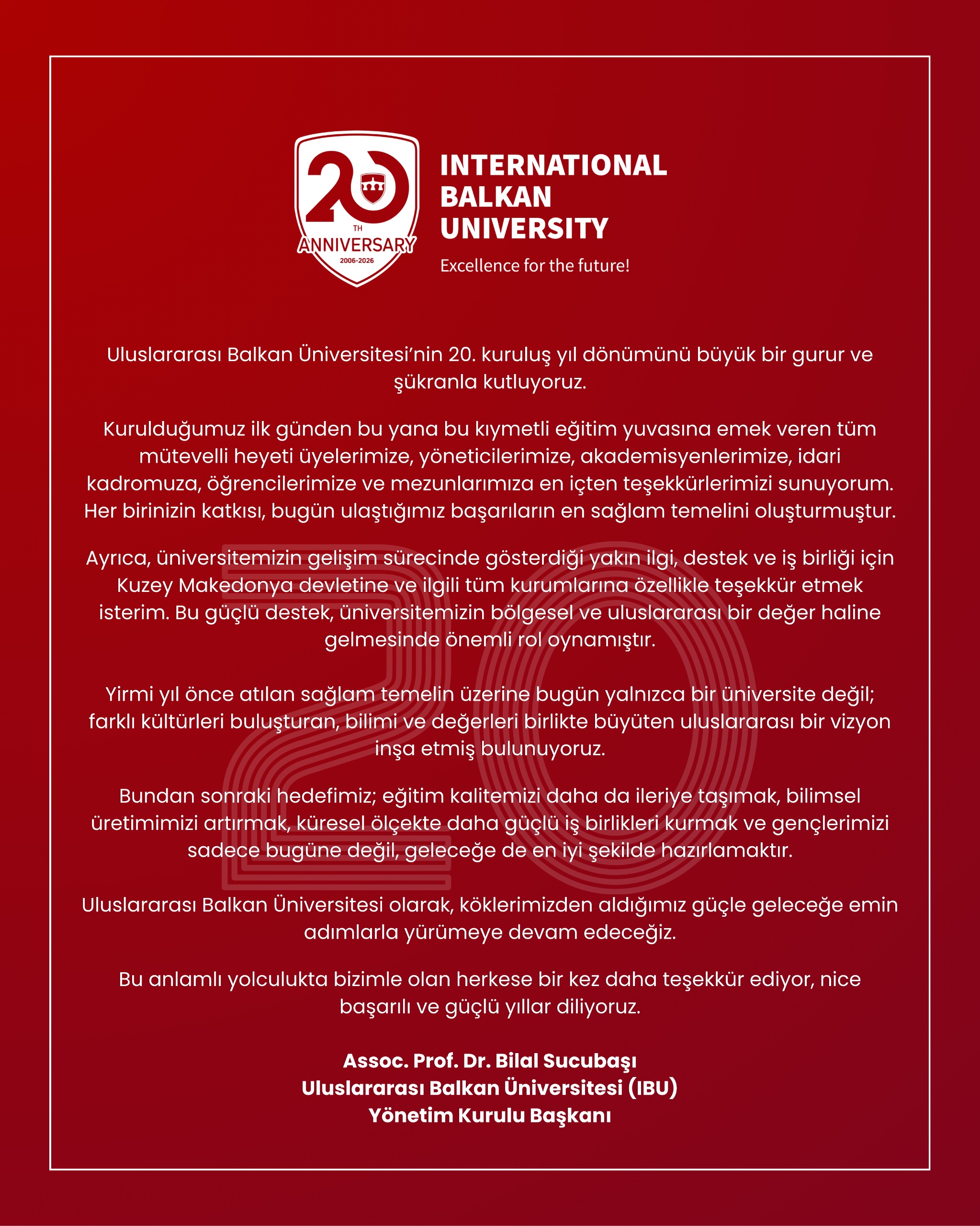 Uluslararası Balkan Üniversitesi’nin 20. kuruluş yıl dönümü dolayısıyla, Yönetim Kurulu Başkanı Bilal Sucubaşı bir kutlama mesajı yayımladı.