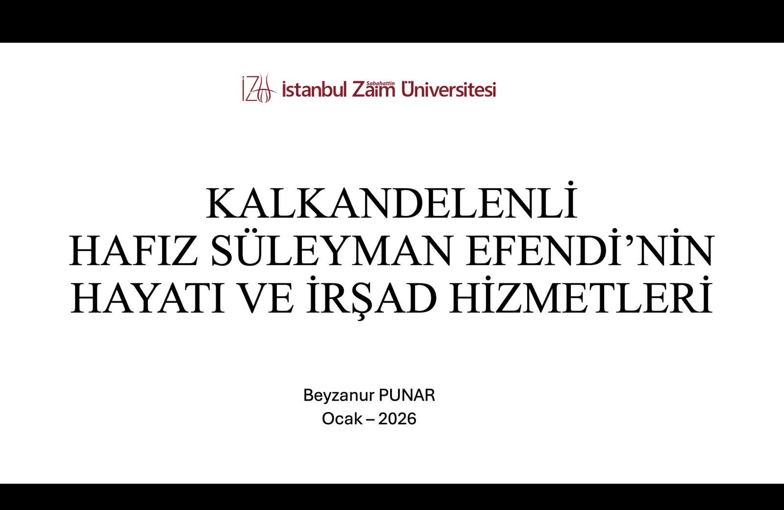 İstanbul “Sabahattin Zaim” Üniversitesi Lisansüstü Eğitim Enstitüsü’nde, aday Beyzanur Punar’ın Kalkandelenli Hafız Süleyman Efendi – Hayatı ve İrşad Hizmetleri” başlıklı yüksek lisans tezi savunuldu.