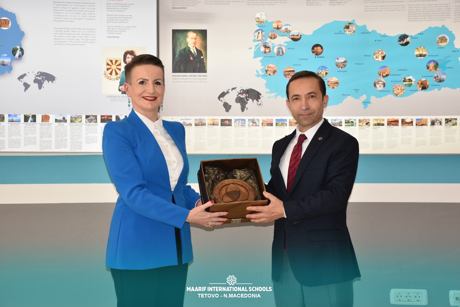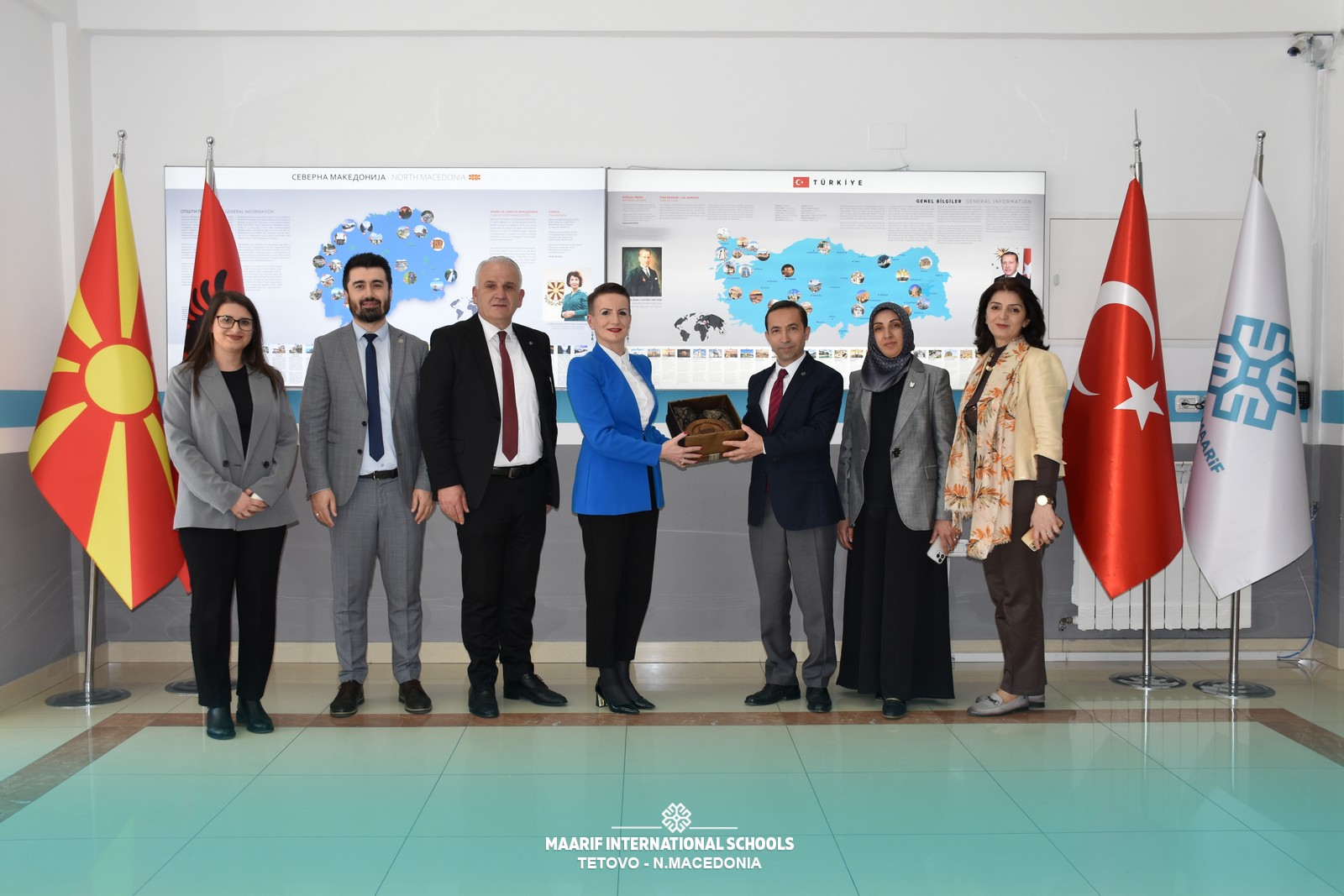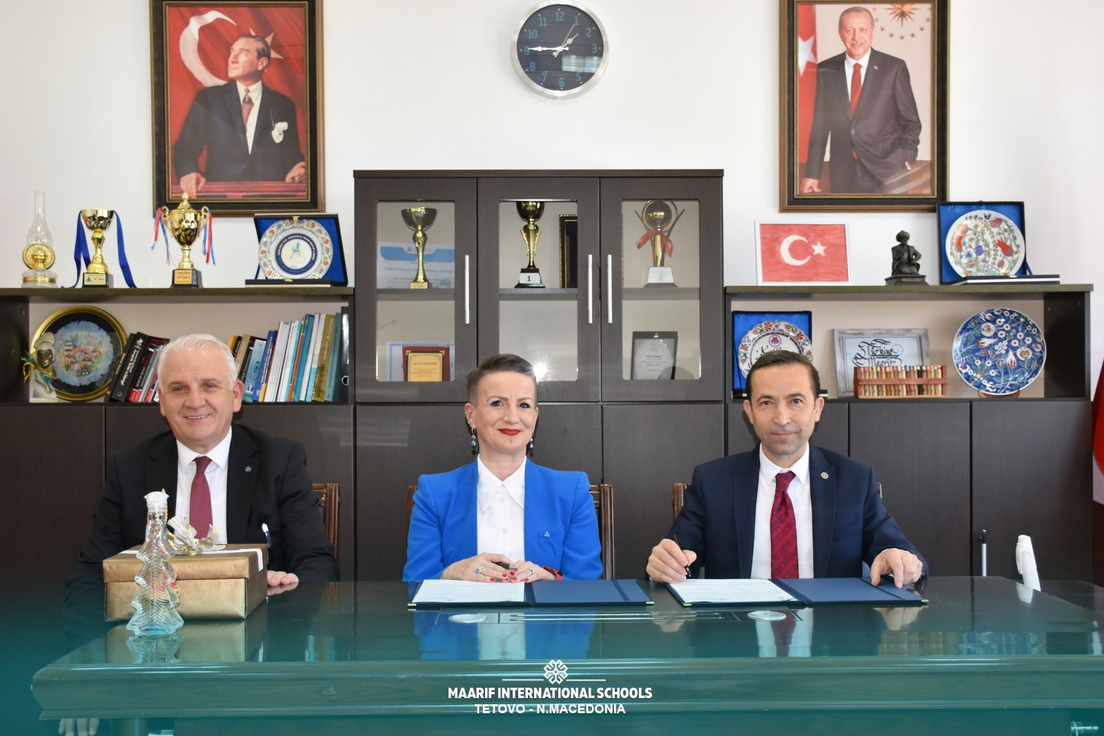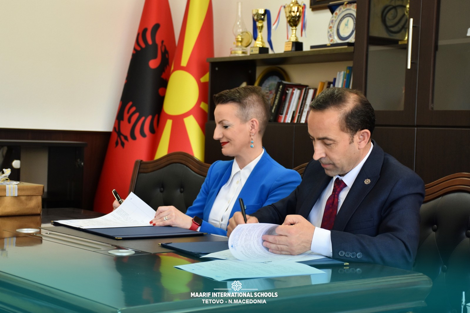 “Güneydoğu Avrupa Üniversitesi Araştırma ve Uluslararası İlişkilerden Sorumlu Rektör Yardımcısı Sayın Prof. Dr. Besa ARİFİ, Planlama ve Girişimcilikten Sorumlu Rektör Yardımcısı Sayın Sadudin İBRAİMİ ve Türkiye Maarif Vakfı Üsküp Temsilcisi Sayın Osman DEMİRGÜL ile beraberindeki heyet, üniversite ve okul arasındaki işbirliğini güçlendirmek ve eğitimdeki kaliteyi artırmak amacıyla bir işbirliği protokolü imzaladılar.