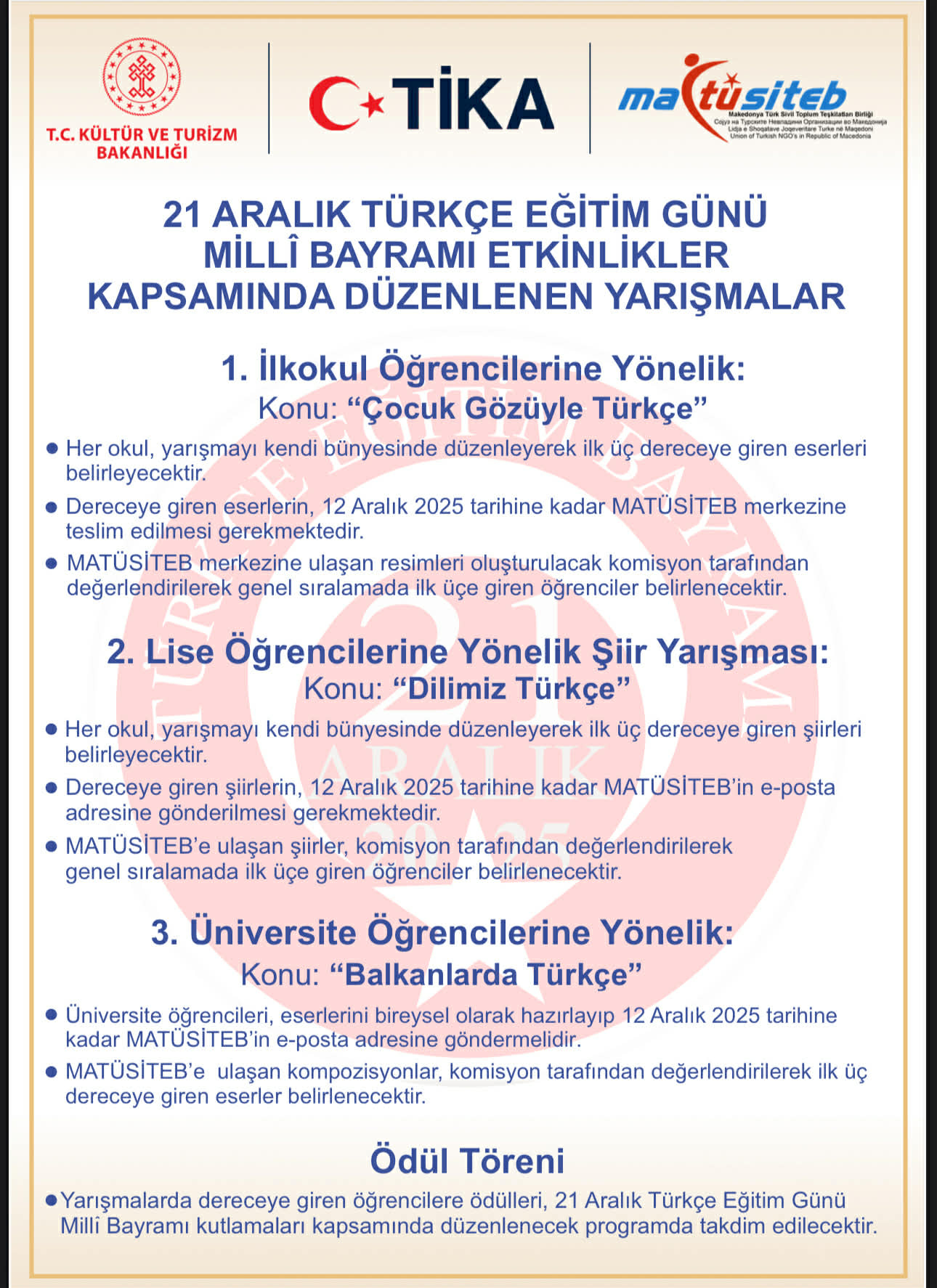 Kuzey Makedonya’daki Türkçe eğitim gören ilkokul, lise ve üniversite öğrenciler için Makedonya Türk Sivil Toplum Teşkilatları Birliği (MATÜSİTEB) tarafından geleneksel 21 Aralık yarışmaları bu yıl da düzenleniyor.