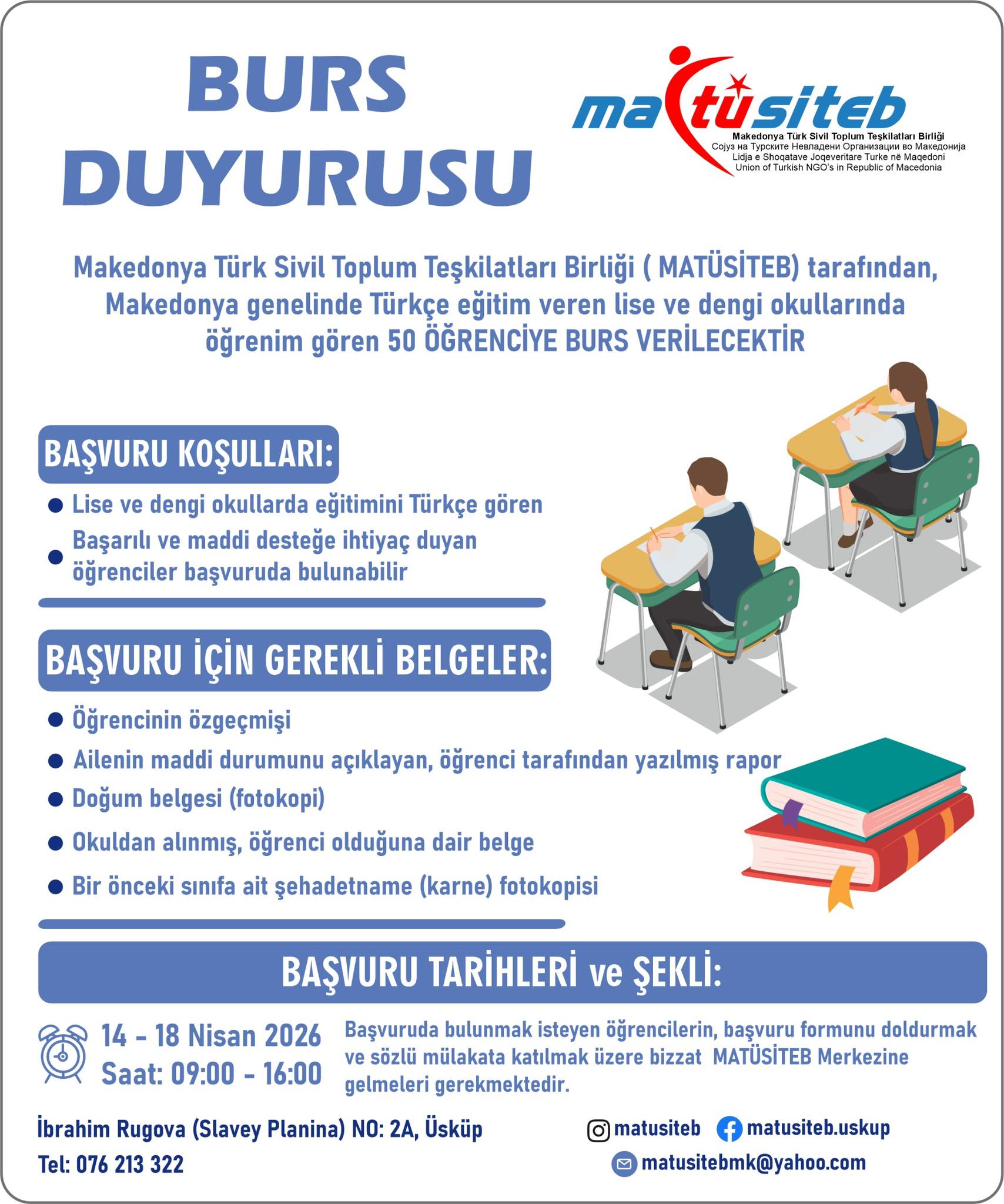 Makedonya Türk Sivil Toplum Teşkilatları Birliği (MATÜSİTEB) tarafından, Makedonya genelinde Türkçe eğitim veren lise ve dengi okullarda öğrenim gören 50 öğrenciye burs verileceği açıklandı.