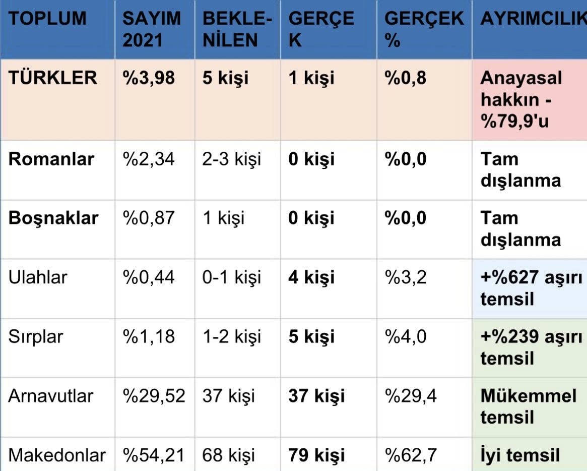 Veriler, sistematik ve seçici bir ayrımcılık örüntüsünü açıkça ortaya koymaktadır. Makedonyalılar ve Arnavutlar nüfus oranlarına göre adil biçimde temsil edilirken, üç topluluk sistematik ayrımcılığa maruz kalmaktadır: