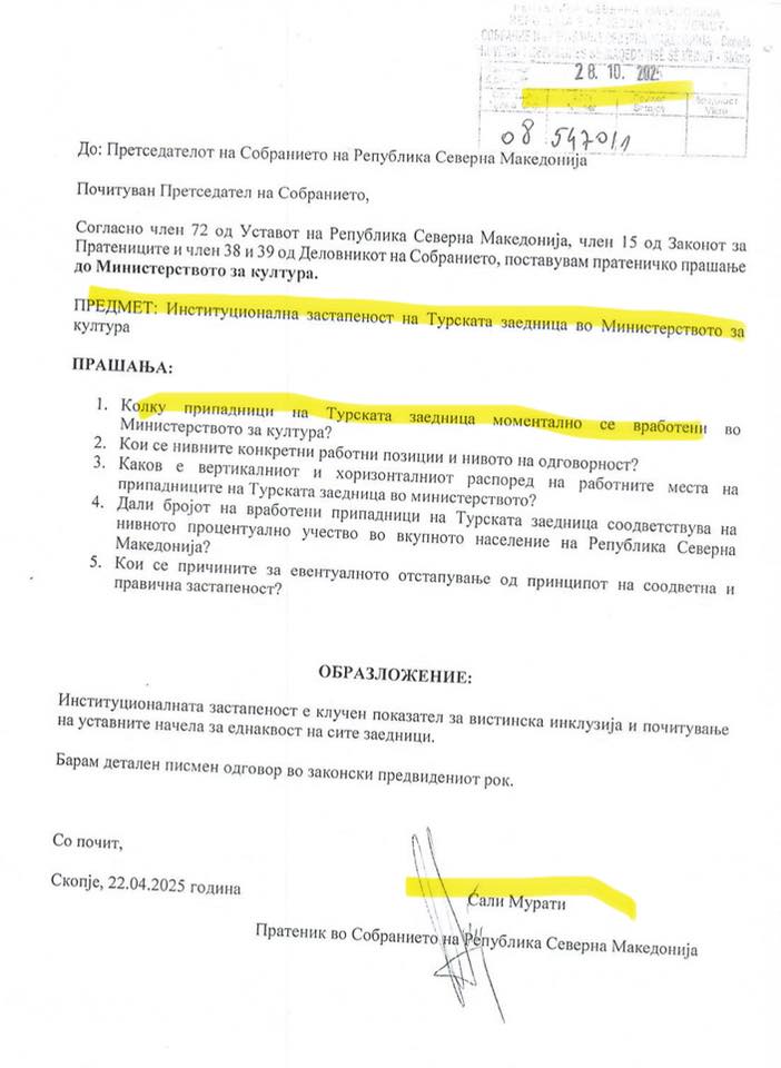 “28 Ekim 2025 tarihinde Kültür Bakanlığı’na, Türk toplumunun bakanlıktaki temsiline ilişkin beş somut talep içeren bir milletvekili sorusu yönelttim. Soru, hukuki temellere dayanıyor ve Anayasa’nın VI. Değişikliği’nin uygulanmasına dair ayrıntılı veriler talep ediyordu.