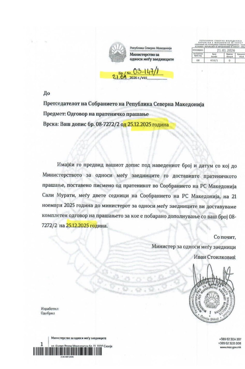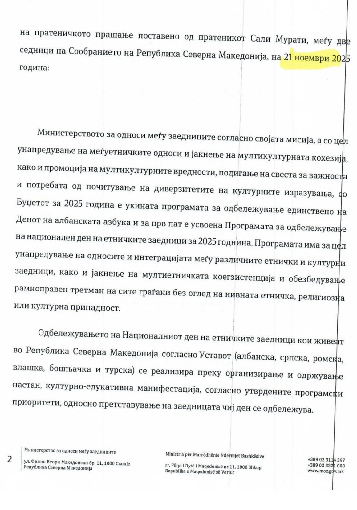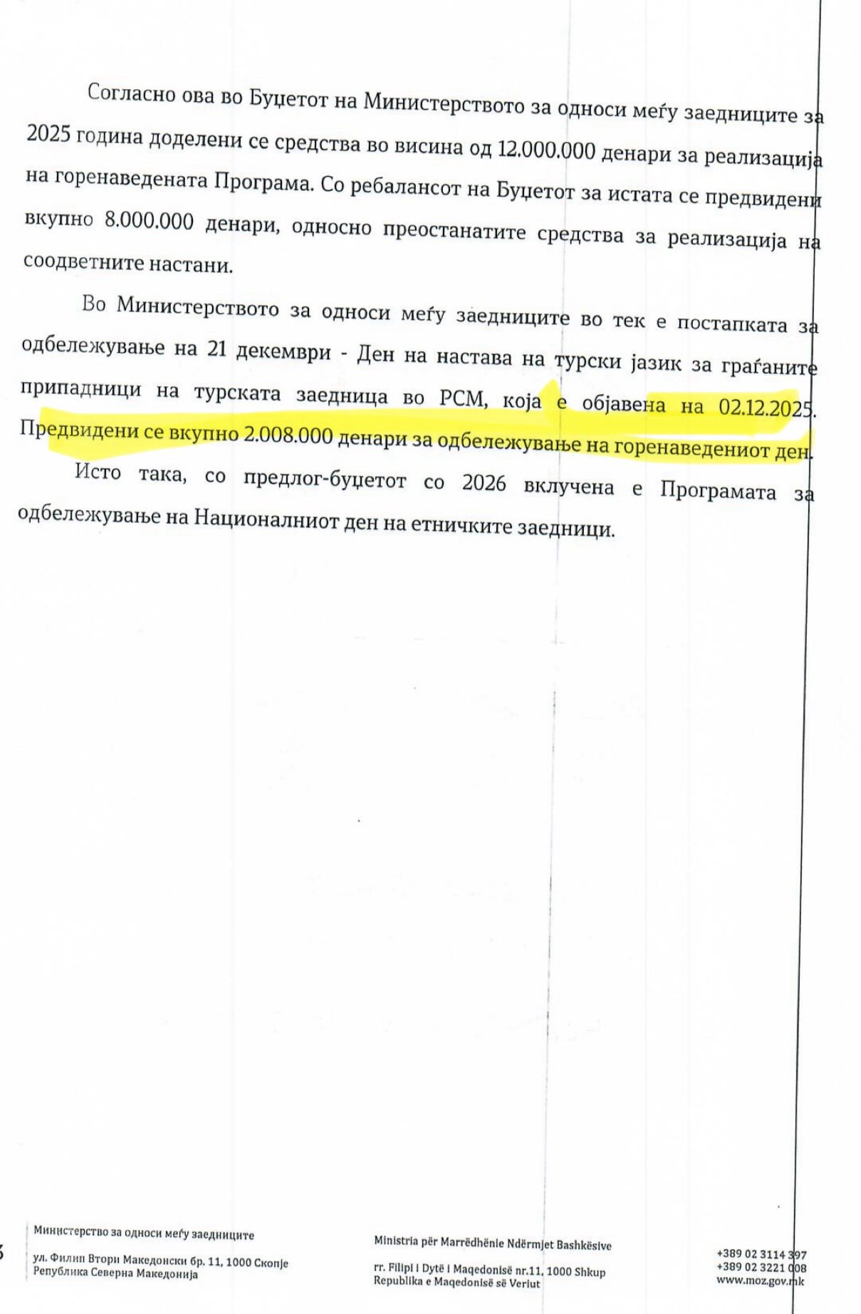 21 Kasım 2025 tarihinde, milletvekili soru önergesiyle Türk topluluğunun millî bayram kutlamaları için bakanlık tarafından ayrılan destek miktarını sordum. 10 Aralık 2025 tarihli yanıtta, 2025 bütçesinde 12 milyon ek bütçeyle birlikte toplam 20 milyon denar öngörüldüğü ifade edildi. Aynı yanıtta, 21 Aralık Türkçe Eğitim günü kutlamalarına ilişkin sürecin devam ettiği ve bu etkinlik için 2 Aralık 2025 itibarıyla toplam 2.008.000 denar öngörüldüğü belirtildi.