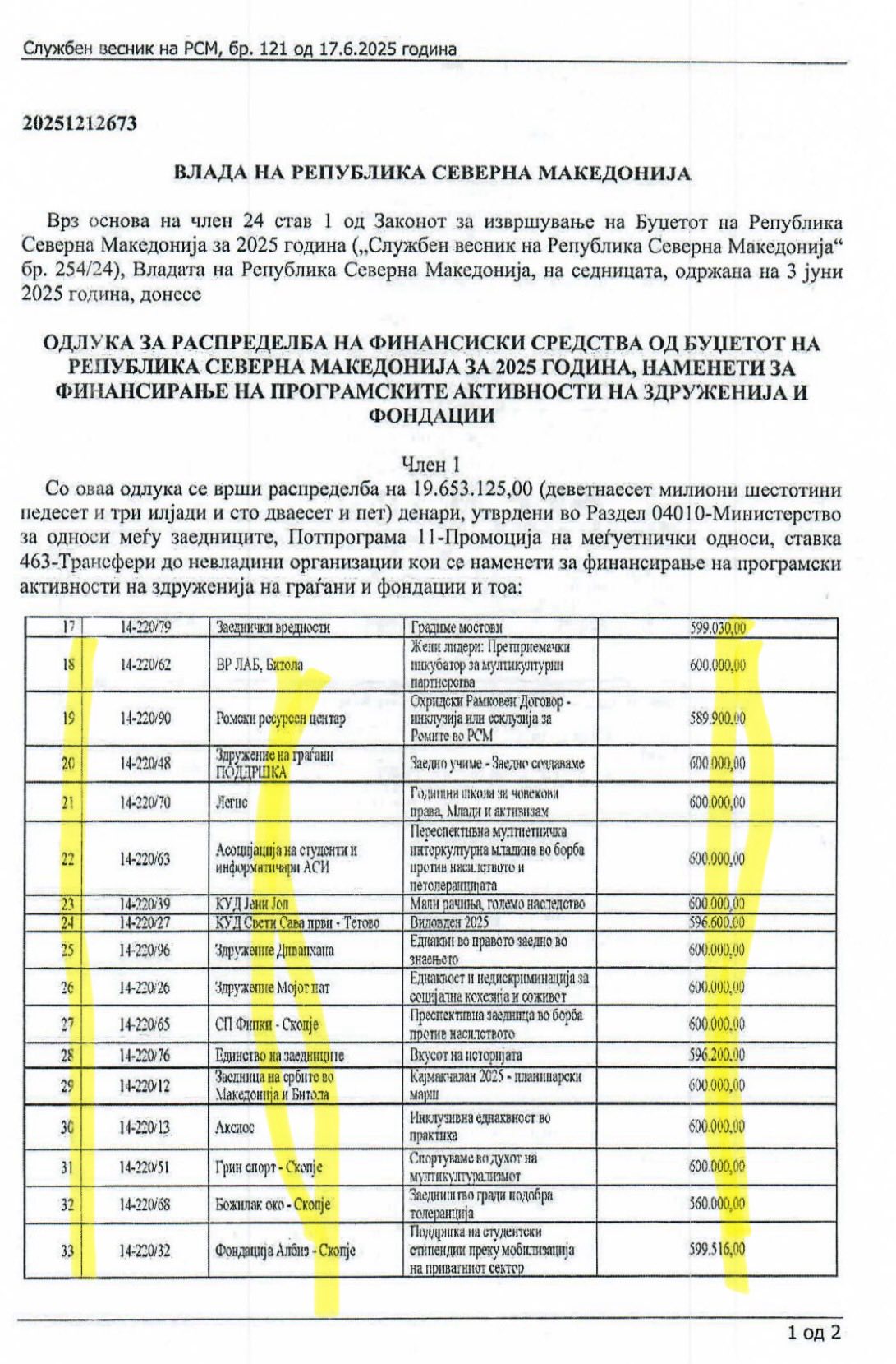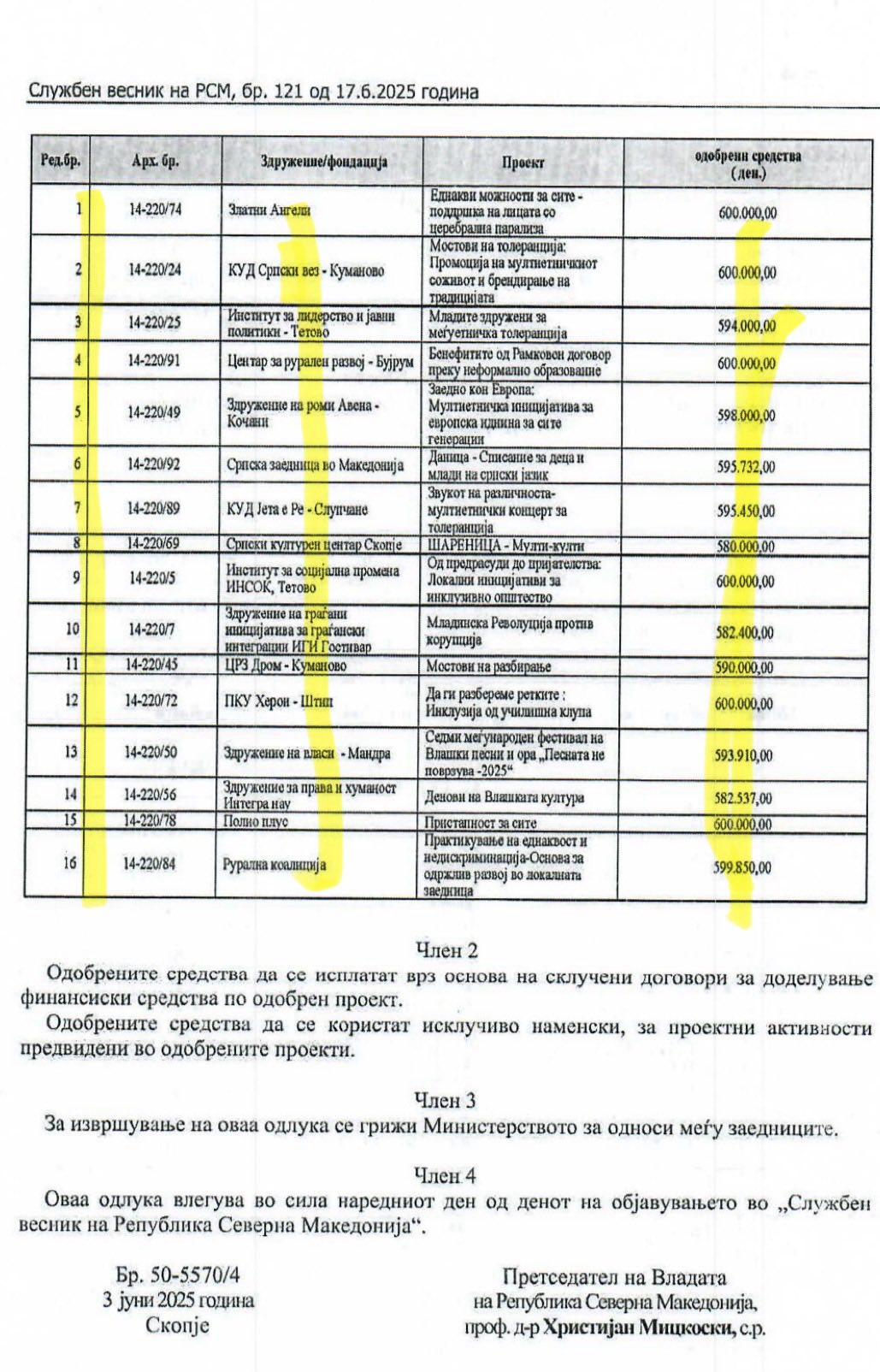 Tabloya bakıldığında tablo son derece çarpıcıdır: 20 milyon denar, 33 başvuruya dağıtılmış; ancak Türk topluluğundan yalnızca 1 başvuru onaylanmıştır. Arnavut topluluğundan da yalnızca birkaç başvuru kabul edilmişken çok çok daha küçük toplulukların çok sayıda başvurusu desteklenmiştir. Bu tablo, programda öngörülen kriterlerin görmezden gelinerek bilinçli bir ayrımcılığın uygulandığını açıkça göstermektedir.