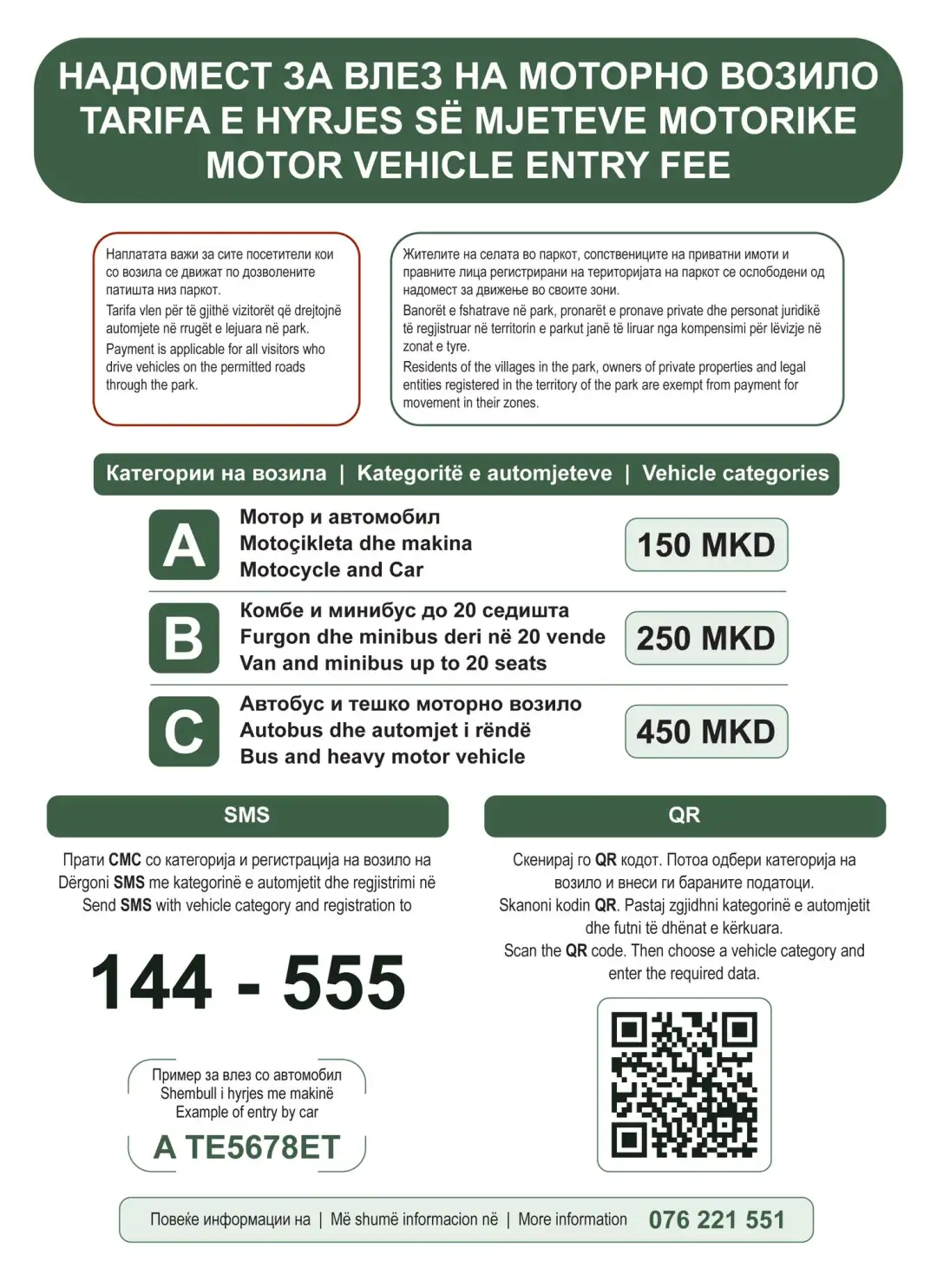 “Motorlu taşıtınız için SMS yoluyla giriş ücreti gönderdiğinizde, Şar Dağı’nın doğasını korumaya doğrudan katkı sağlıyorsunuz ve bu benzersiz doğal zenginliğin gelecek nesiller için korunmasına yardımcı oluyorsunuz. Millî Park yönetiminin stratejik yaklaşımı, ekolojik iz bırakmayan ziyaretçilerden giriş ücreti almamaktır.”