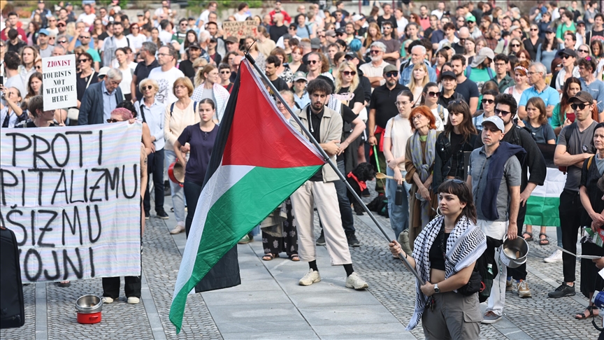 Başkentteki Cumhuriyet Meydanı’nda toplananlar, “Gazze aç, hükümet ne yapıyor”, “Slovenya, Gazze’deki soykırımı durdurmak için harekete geç” yazılı dövizler taşıdı.