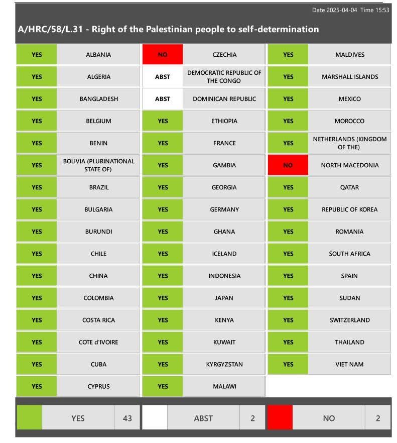 “04.04.2025 tarihinde BM İnsan Hakları Komisyonunda yapılan oylamada Filistin lehine iki olumlu karar oylandı fakat ülkemin yetkilileri HAYIR oyu kulanmış.Kararda, İsrail’in tüm sömürgeci faaliyetlerin derhal ve koşulsuz olarak durdurulması, mevcut sömürgelerin kaldırılması, Filistinlilere yönelik ırk ayrımcılığı ve zorla yerinden etme politikalarının durdurulması çağrısı yapılıyor.