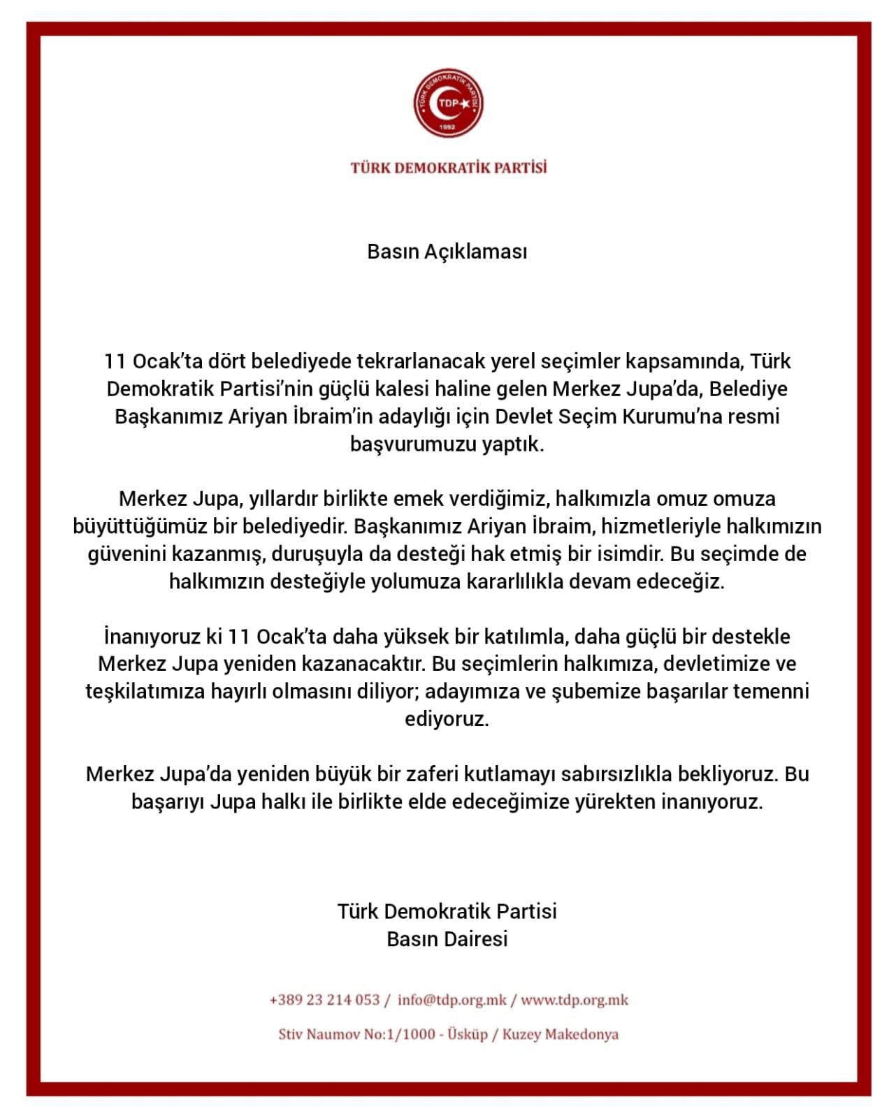 Türk Demokratik Partisi (TDP), 11 Ocak’ta Merkez Jupa dahil 4 belediyede düzenlenecek tekrar yerel seçimlerde Merkez Jupa Belediye Başkanlığına yeniden Ariyan İbraim’i aday gösterdi.